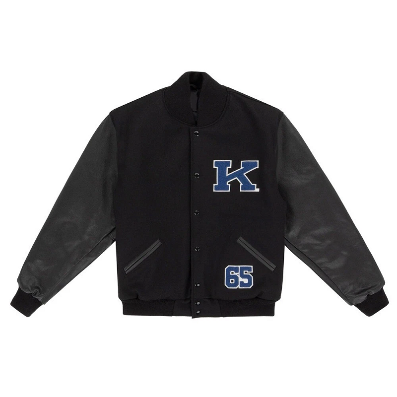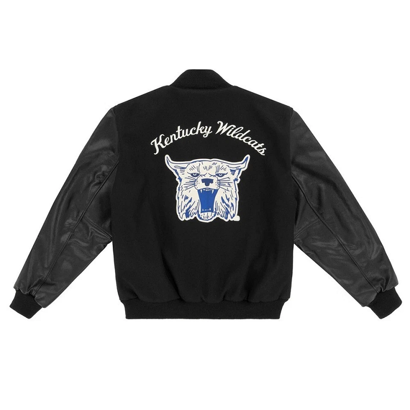 Designed with premium materials, it includes a comfortable quilted lining, striped rib-knit collar, cuffs, and hem, plus a traditional snap-button front for an authentic varsity look. Whether worn to the game, around campus, or as a collector’s piece, this jacket captures the true spirit of Big Blue Nation.