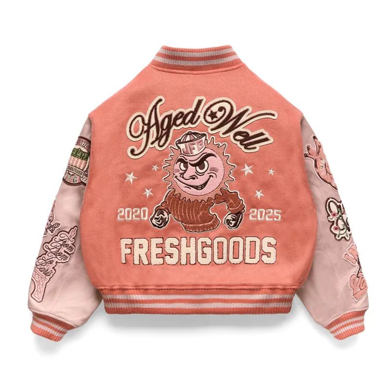 Constructed with a wool-blend body and contrast faux leather sleeves, it features intricate chenille patches, embroidered “Aged Well” lettering, and signature Freshgoods motifs throughout. Ribbed cuffs, hem, and a snap-button front give it that authentic varsity feel with modern flair.