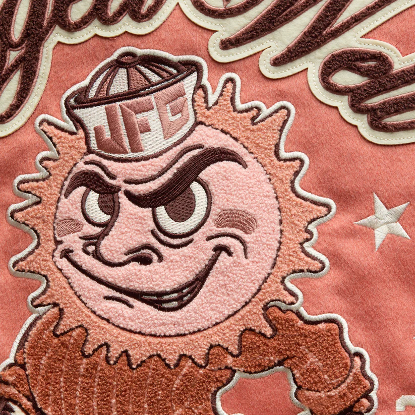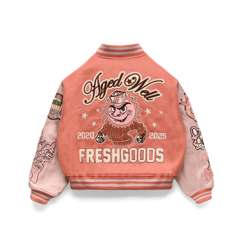 The Aged Well Wool Varsity Jacket blends classic varsity style with premium craftsmanship. Made from a 50% wool / 50% polyester body, it features a buttoned closure, high-density satin stitch and chainstitch embroideries, chenille patches, and front welt pockets. With a relaxed fit and viscose lining, this jacket delivers both comfort and timeless style.