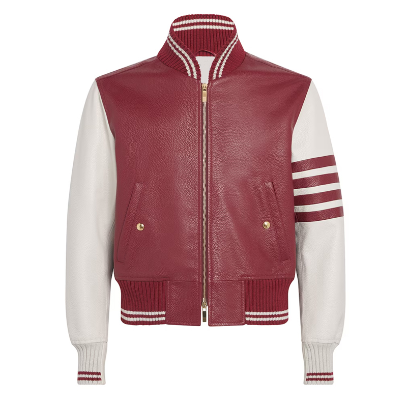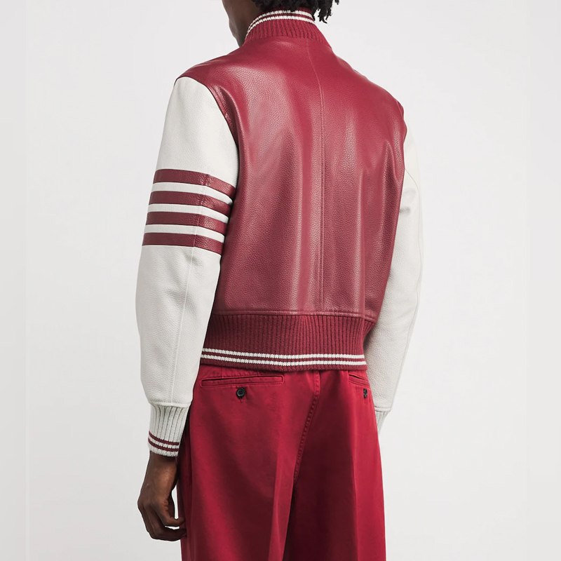 Crafted from premium genuine leather, the jacket features a deep burgundy body complemented by crisp white sleeves, embodying a perfect balance of class and edge. The contrasting rib-knit collar, cuffs, and waistband enhance its structured varsity fit, while embroidered and chenille patch detailing give it an exclusive designer touch. A soft quilted interior lining ensures all-day comfort and warmth, making this jacket as functional as it is fashionable.