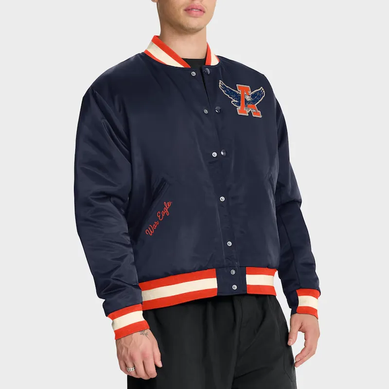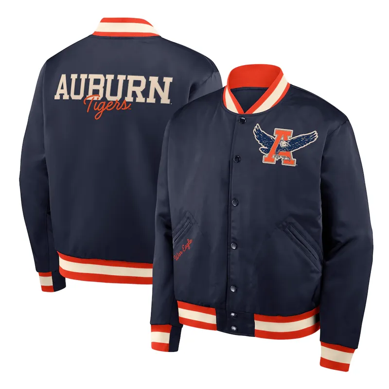 Made from premium satin fabric, it features embroidered Auburn logos and lettering that celebrate the team’s legacy of excellence. The deep navy finish gives it a sleek, versatile look, while rib-knit cuffs, collar, and waistband provide a comfortable, secure fit. With its snap-button front closure and soft inner lining, this jacket delivers both warmth and style for any occasion.