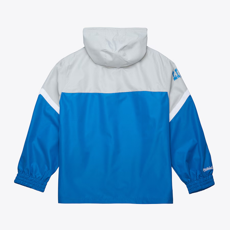 Crafted from durable, wind-resistant fabric, it features bold Lions graphics on the chest and back, making your team spirit unmistakable. The pullover style with a quarter-zip front and adjustable hood adds versatility, while the spacious kangaroo pocket and elastic cuffs keep you comfortable on the go.