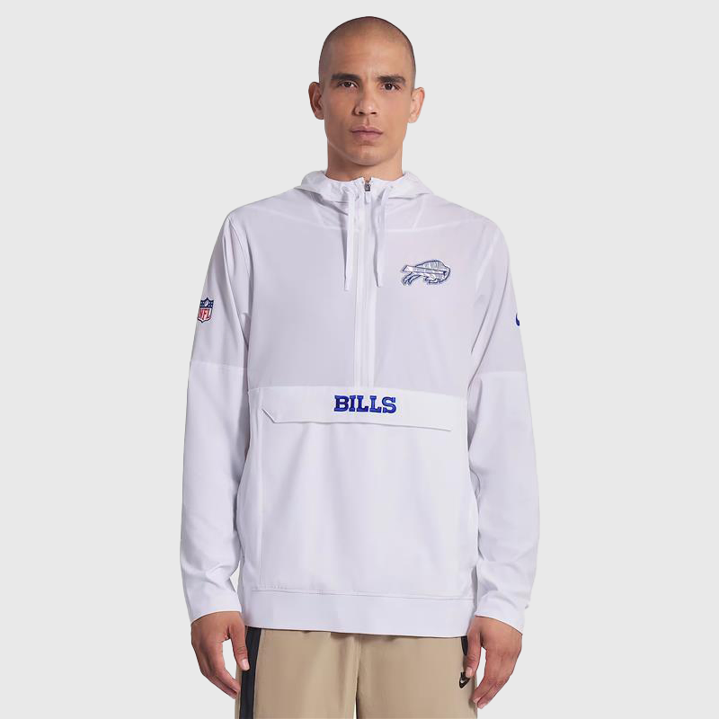 Crafted from lightweight yet durable woven fabric, this pullover anorak features a half-zip front with a storm flap to shield you from wind and light rain. Signature Bills colors and official Nike branding create a bold game-day look, while the roomy front pouch pocket adds convenience for carrying essentials. Adjustable cuffs and a drawcord hem let you customize your fit, and a breathable mesh lining keeps you comfortable through changing weather conditions.