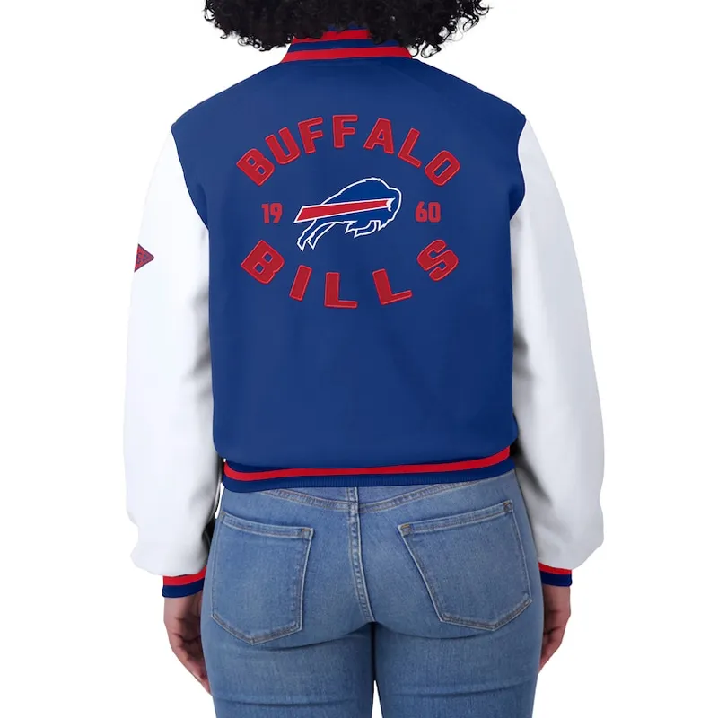 Stand out in true Bills Mafia fashion with the NFL Buffalo Bills Royal and White Varsity Jacket. This classic varsity-style jacket features a bold royal blue body with sharp white sleeves, delivering a timeless, athletic look backed by authentic team spirit. Embroidered Buffalo Bills logos on the chest and back make your allegiance unmistakable.