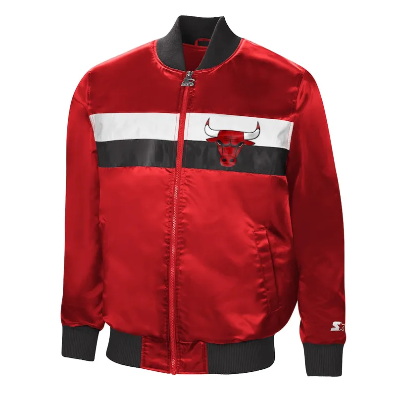 Crafted from durable, high-quality satin, the jacket features a vibrant red, white, and black color block design that mirrors the classic Carmine aesthetic. The embroidered Chicago Bulls logo on the chest and Starter branding on the cuff and back elevate its authentic appeal. With its full snap-button front, rib-knit collar, cuffs, and waistband, and soft inner lining, this jacket delivers both comfort and court-ready flair.