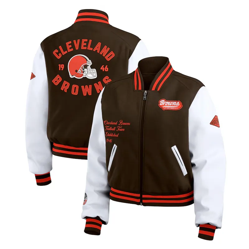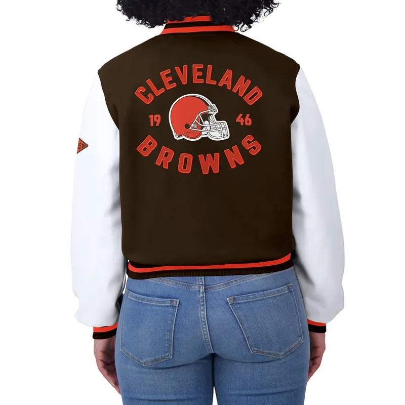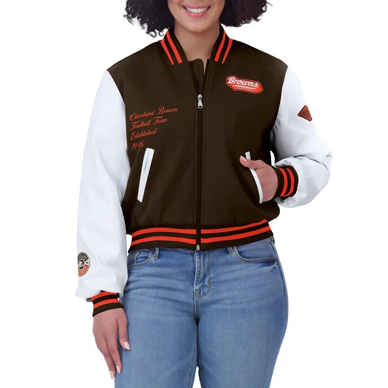 Show off your Dawg Pound pride in timeless style with the NFL Cleveland Browns Brown and White Varsity Jacket. Featuring a rich brown body and crisp white sleeves, this classic varsity silhouette is a bold tribute to one of the NFL’s most storied teams.