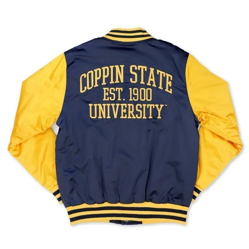 Show your Coppin State Eagles pride with the Navy and Gold Satin Jacket, a stylish and comfortable way to represent CSU. Made from 100% premium satin fabric, this jacket offers a sleek, smooth finish with a lightweight yet durable feel. The bold navy and gold color combination embodies the spirit of the Eagles, while the snap-tab buttoned front closure adds a touch of classic varsity style. Designed for both fashion and functionality, it features a relaxed fit, full sleeves, front welt pockets, and a soft viscose lining for warmth and breathability. Whether you’re cheering from the stands or showcasing your school pride daily, this jacket is the perfect statement piece for any Coppin State fan.