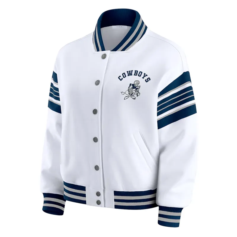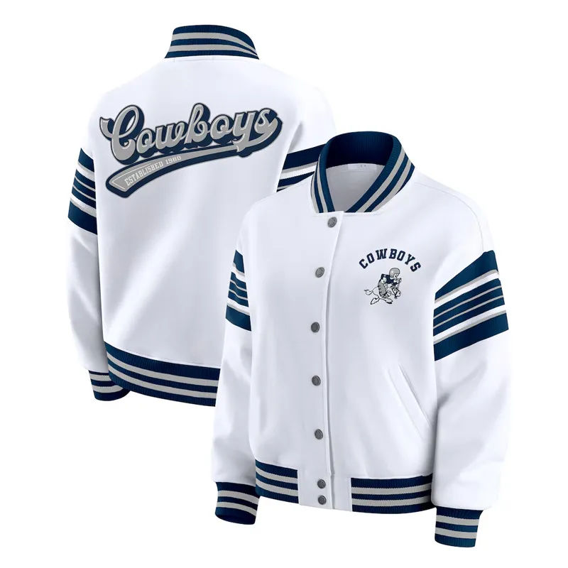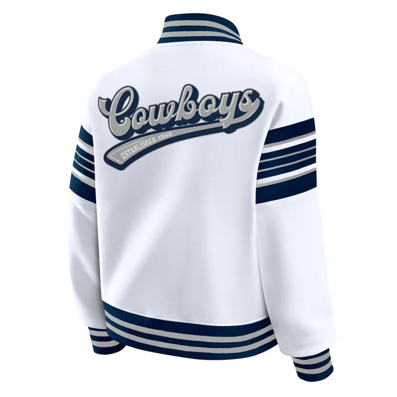 The crisp white design paired with the iconic Dallas Cowboys star logo makes this piece stand out, reflecting the team’s legacy of excellence. Designed with a full-zip front, rib-knit cuffs and hem, and two front pockets, it combines modern comfort with timeless NFL style.