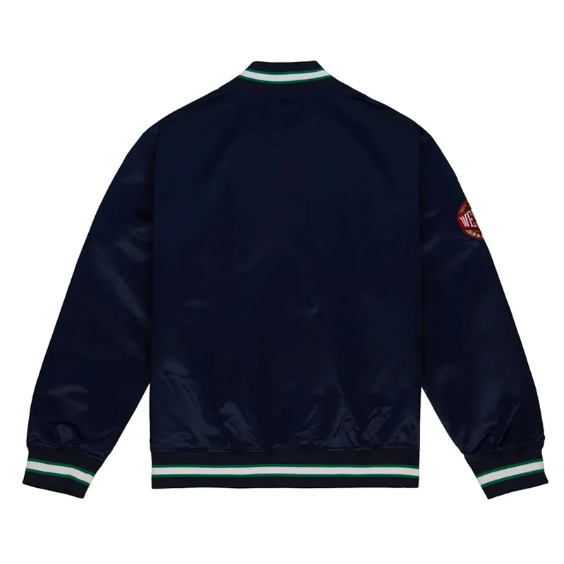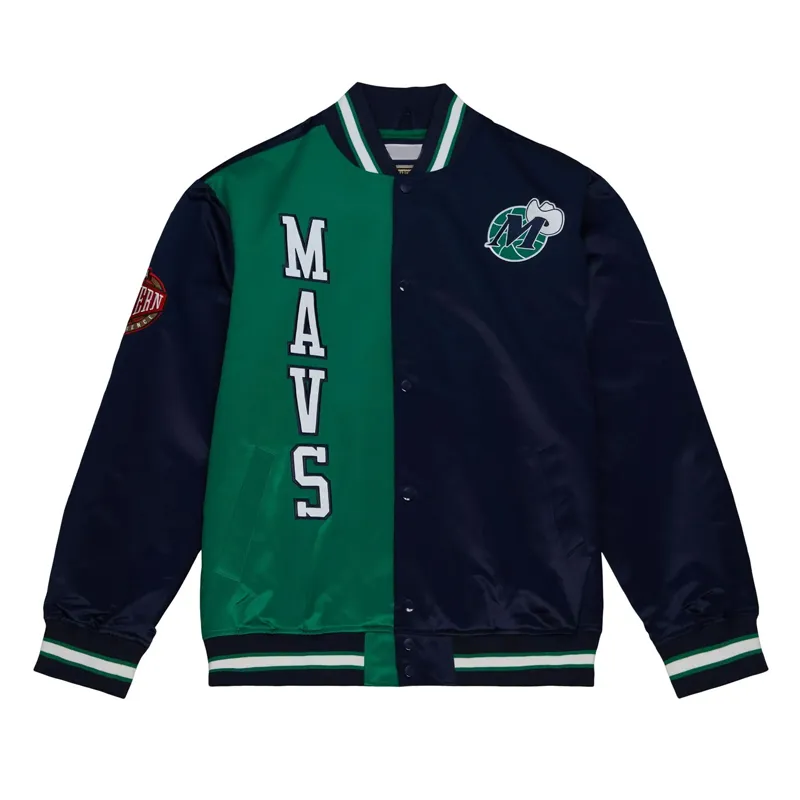 Crafted from premium lightweight satin, it features a vibrant green body paired with contrasting navy sleeves and trims, creating a bold two-tone look inspired by the Mavericks’ heritage. The front showcases the iconic “M-Hat” Mavericks logo, beautifully embroidered for a sleek, authentic finish. On the back, a large team wordmark adds a statement-making touch that commands attention wherever you go.