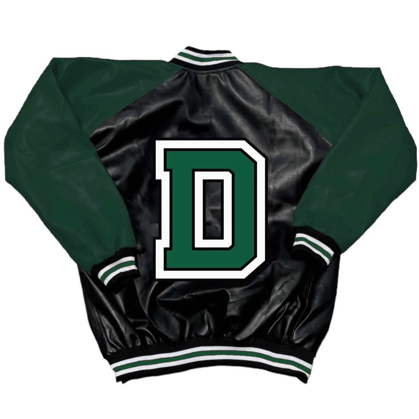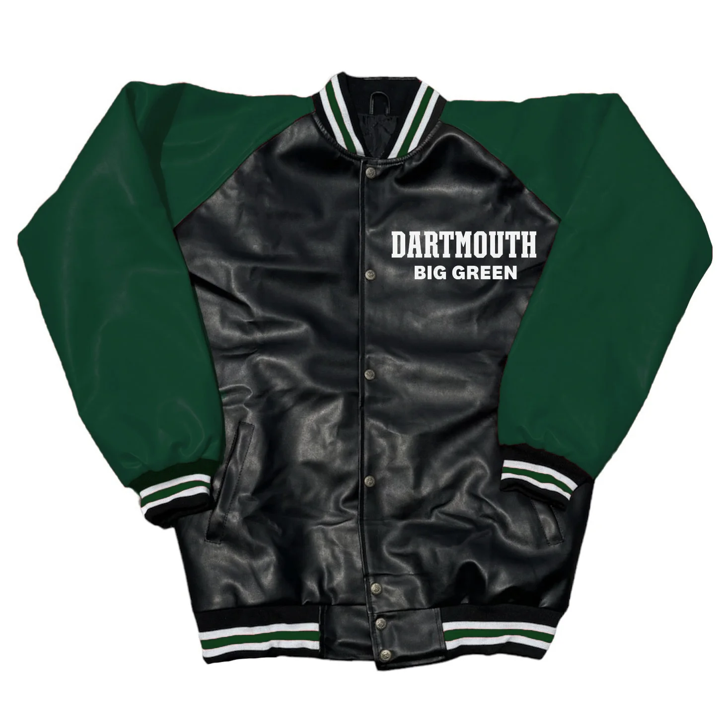 Show off your school spirit with the Dartmouth College Varsity Letterman Jacket, a perfect blend of style and comfort. Crafted from 60% polyurethane and 40% PVC, this jacket is both durable and stylish. Available in black and green, it features a classic buttoned front closure, giving it a timeless varsity look. The full sleeves provide warmth, while the front welt pockets add a touch of convenience. Designed for a relaxed fit, the soft viscose lining ensures all-day comfort. Whether you’re cheering at a game or out for a casual day, this jacket is a standout choice.