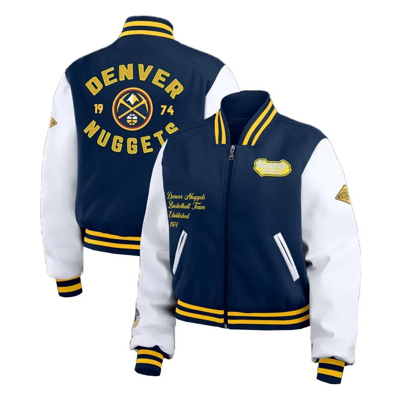 Show your Mile High pride in style with the NBA Denver Nuggets Navy and White Varsity Jacket. Featuring a deep navy body paired with crisp white sleeves, this classic varsity silhouette is elevated by detailed embroidered Nuggets logos and lettering that celebrate your team loyalty with bold flair.