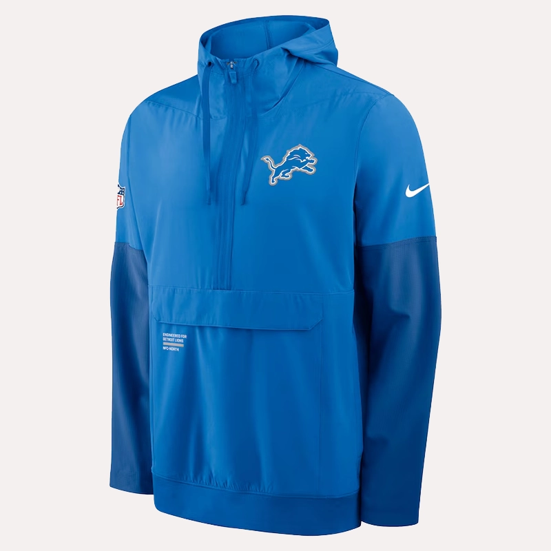 Crafted with lightweight yet durable material, it features a half-zip front, adjustable hood, and a front zip kangaroo pocket to keep essentials secure. Built with Nike’s wind- and water-resistant fabric, it helps you stay protected in unpredictable weather, while the Detroit Lions logo on the chest and official team colors let everyone know who you stand with.