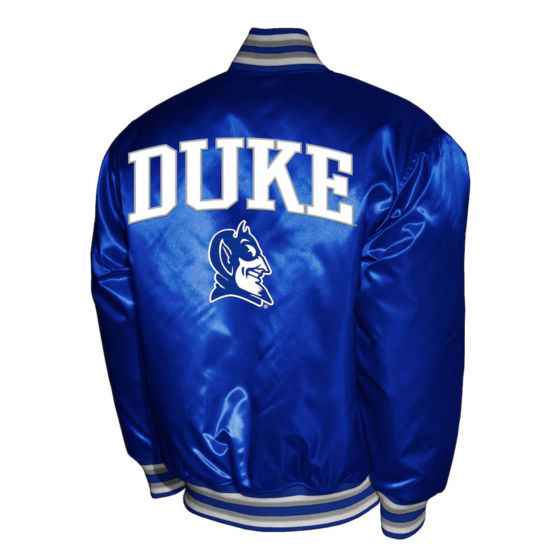 The royal blue satin exterior shines with bold energy, complemented by white and black rib-knit trims for a sharp contrast. Across the chest, the embroidered Duke Blue Devils wordmark and team logo stand out proudly, symbolizing excellence on the court and beyond. Inside, the quilted lining ensures lasting warmth and comfort, while the full-snap front closure and striped collar, cuffs, and hem complete the authentic collegiate look.