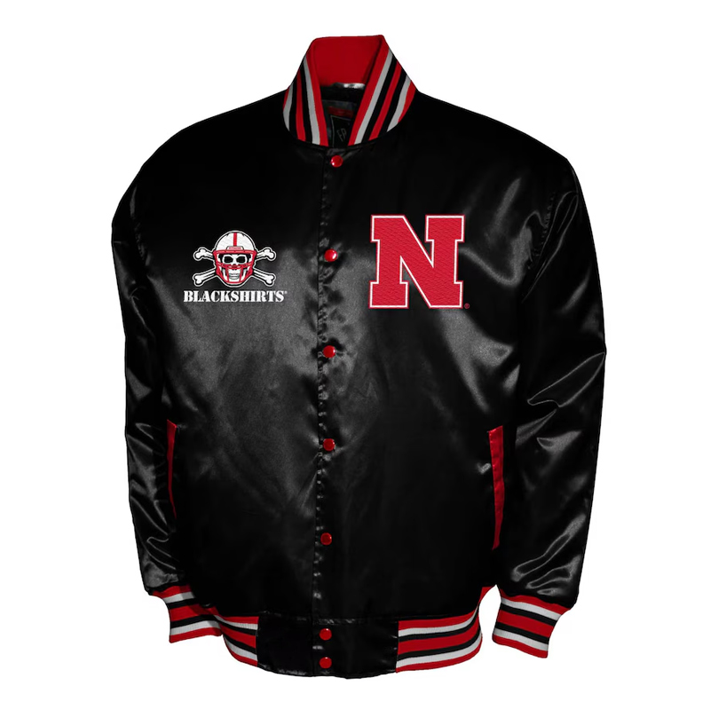 Constructed from high-quality satin fabric, the jacket delivers a smooth, lustrous finish that stands out while keeping you comfortable. Its black base is accented with red and white detailing, celebrating the University of Nebraska’s iconic colors. The embroidered Nebraska “N” logo on the chest and Huskers script on the back proudly represent your team allegiance.
