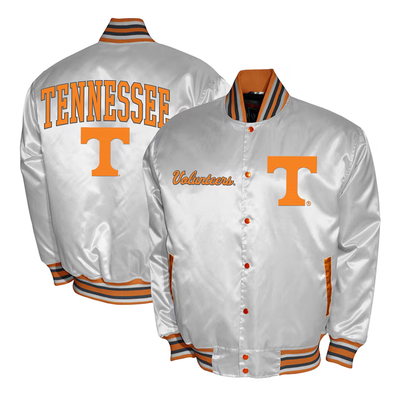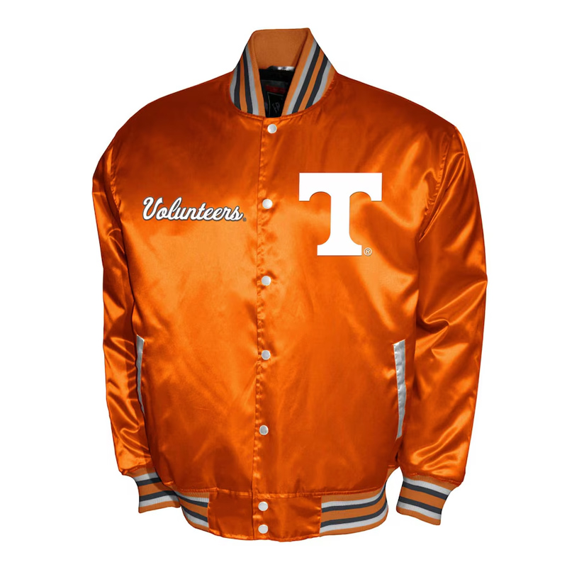 Crafted from high-quality glossy satin, it features the Volunteers’ signature bright orange colorway with crisp white detailing, making it an instant standout. The embroidered Tennessee “Power T” logo on the chest and bold “Volunteers” lettering across the back proudly display your school allegiance. Inside, a soft quilted lining ensures warmth and all-day comfort, perfect for cool game nights or casual campus wear.