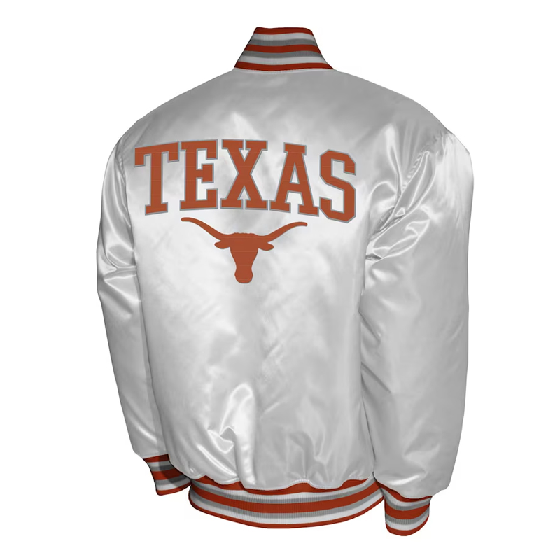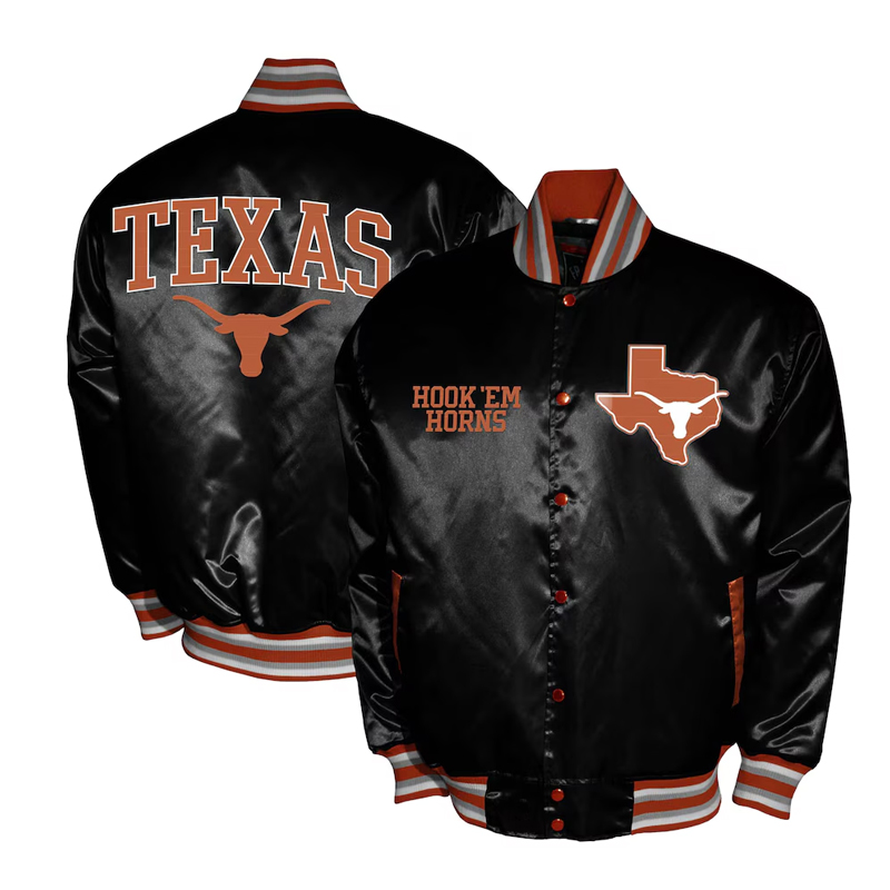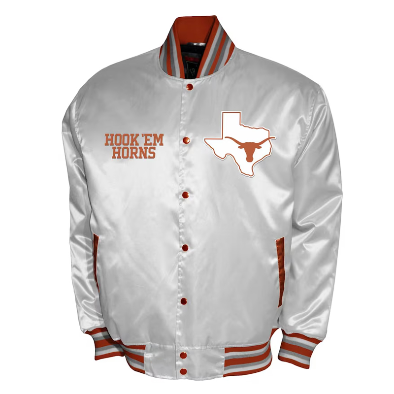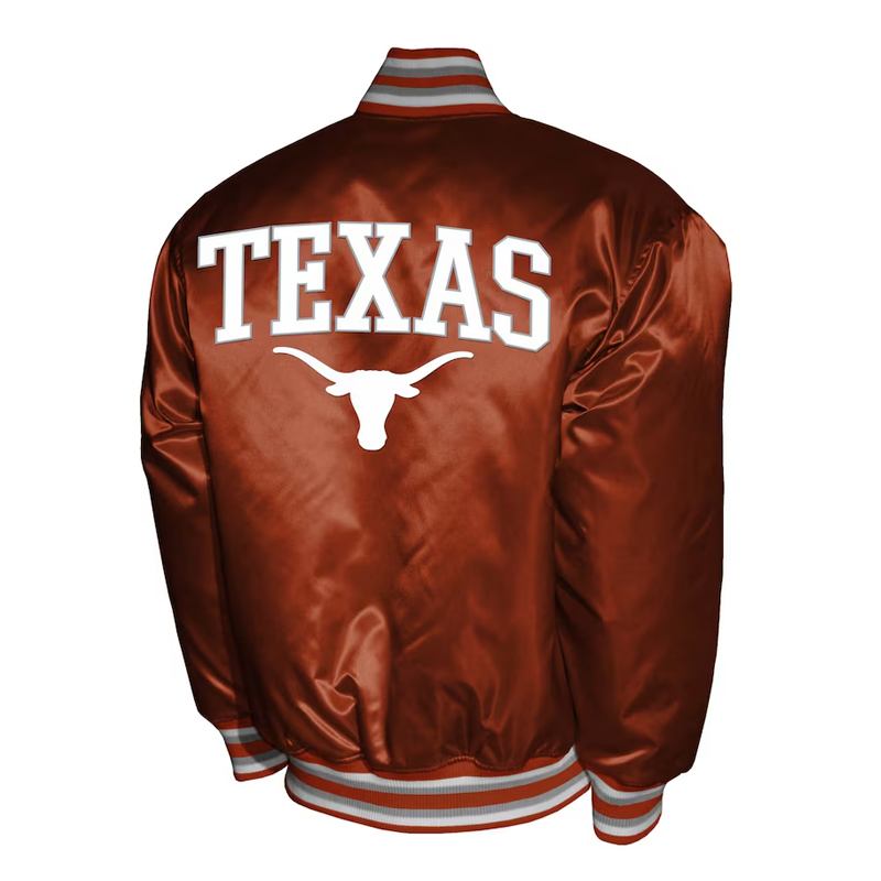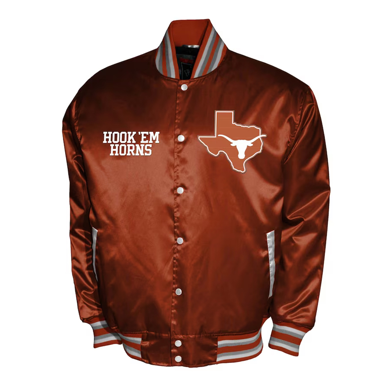 Crafted from luxurious burnt orange satin, it features embroidered Texas Longhorns logos and wordmarks that stand out in crisp white detailing. The striped rib-knit collar, cuffs, and waistband add a timeless varsity finish, while the full-snap button front and quilted lining ensure lasting comfort and durability whether you’re in the stands or on the streets.