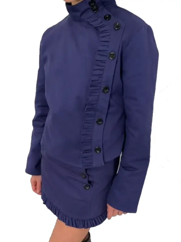 Crafted from premium-quality fabric, this jacket features intricate frill detailing along the front placket and cuffs, exuding a graceful, feminine allure. The structured silhouette enhances your figure while offering a polished, refined look suitable for both casual chic and formal occasions.