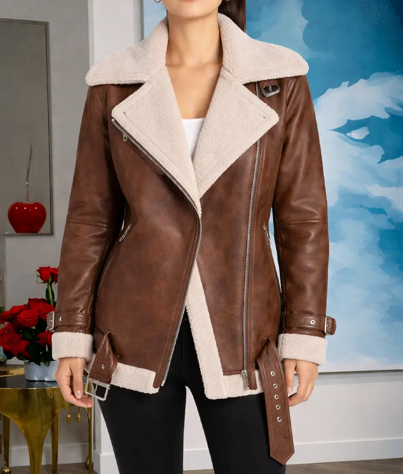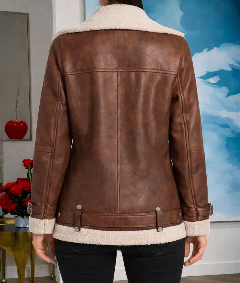 Faux-Shearling Trim: Features a plush, cream-colored faux-fur collar that provides instant warmth and a soft, feminine contrast to the rugged leather exterior.