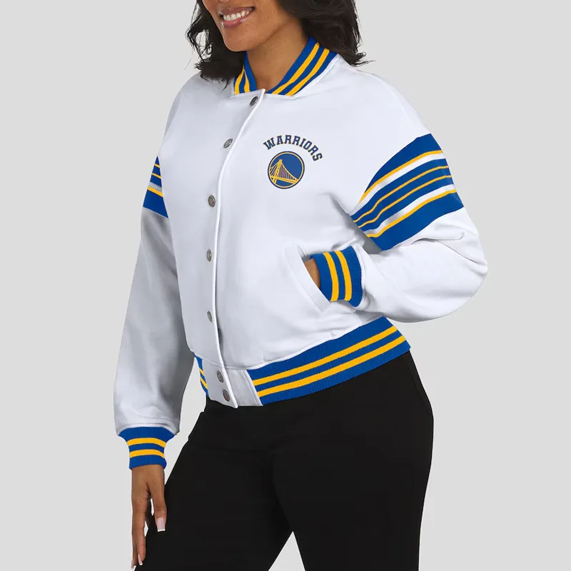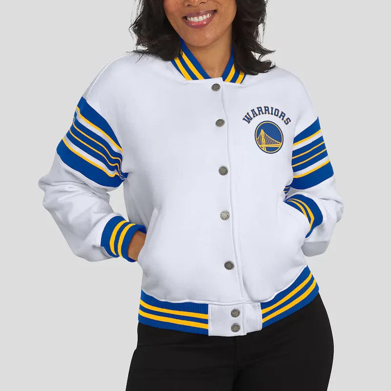 Show your Dubs pride in sleek, cozy style with the White NBA Golden State Warriors Fleece Jacket. Crafted from premium soft fleece, this jacket combines unbeatable comfort with a clean, modern design — perfect for true Golden State fans. The crisp white finish is highlighted by the official Warriors logo, making it a standout piece whether you’re at Chase Center or out in the city.
