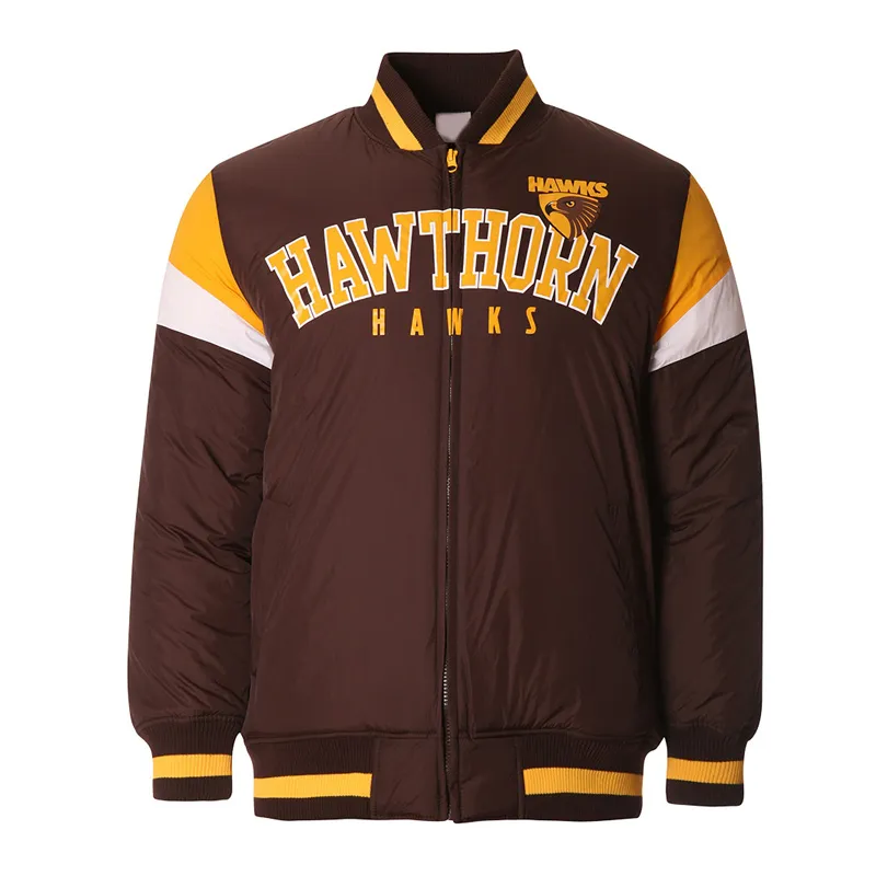 Embroidered Hawthorn Hawks logos and heritage-style patches highlight your loyalty, while striped ribbed cuffs, collar, and hem add that authentic varsity finish. Perfect for chilly match days or everyday wear, it’s the ultimate outerwear piece for true Hawks fans.