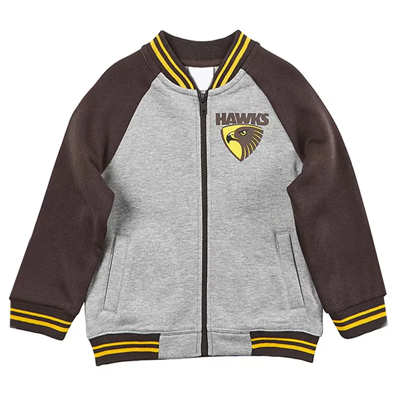 The gray body contrasts with navy sleeves and ribbed striped trims, while embroidered Hawthorn Hawks logos and patches show off your club pride. Finished with a snap-button front and roomy pockets, it’s an easy go-to for everyday wear or game-day layering.