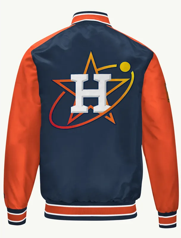 The deep blue satin body contrasted with bright orange sleeves and striped rib-knit trim creates an eye-catching design that screams Astros pride. The embroidered Houston Astros logo on the chest and bold team script on the back add an unmistakable statement of loyalty.