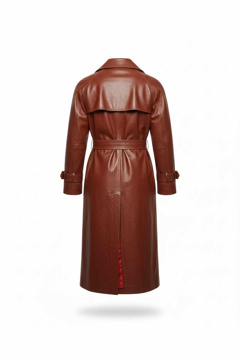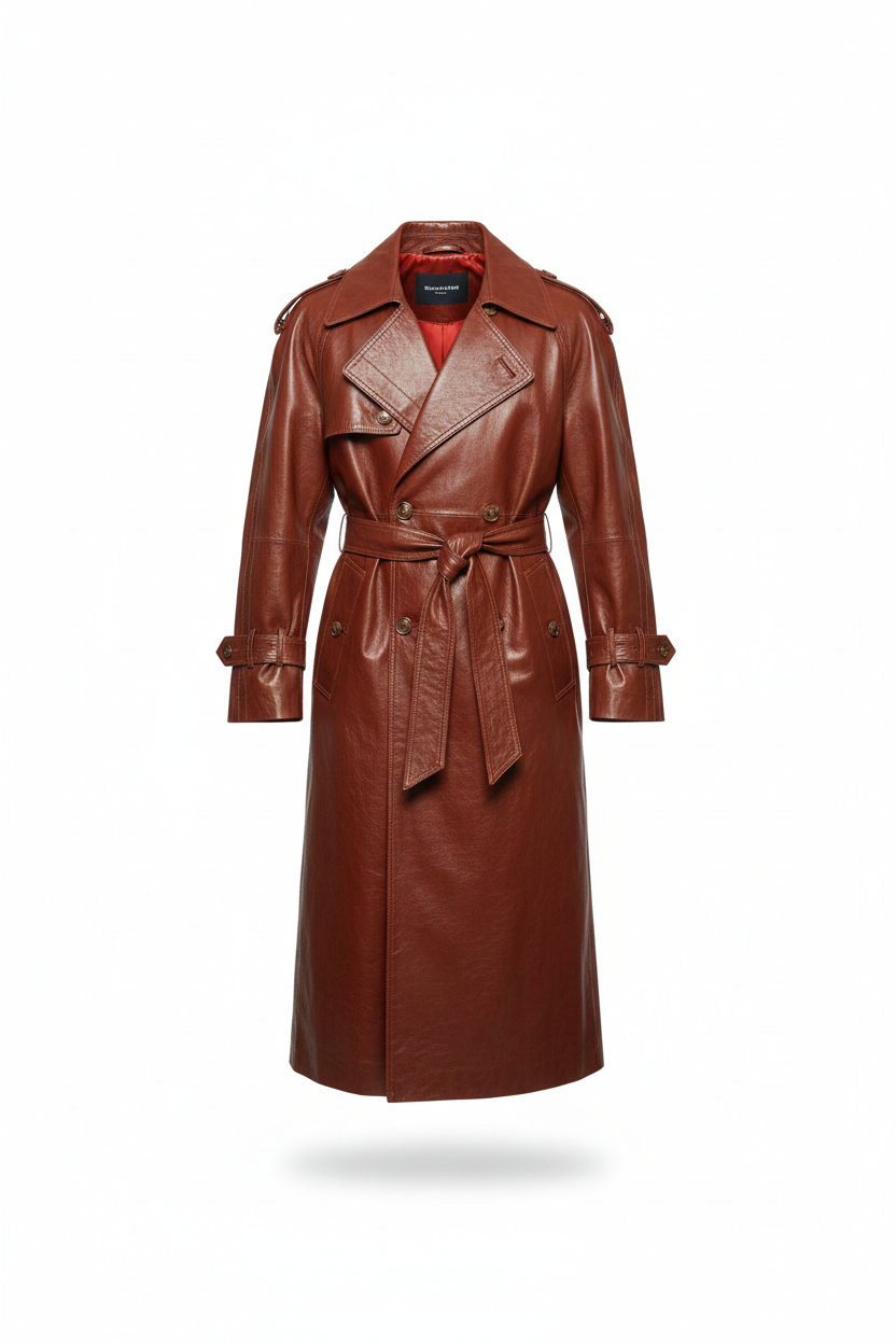 Men’s Belted Long Double Breasted Leather Trench Coat – Brown