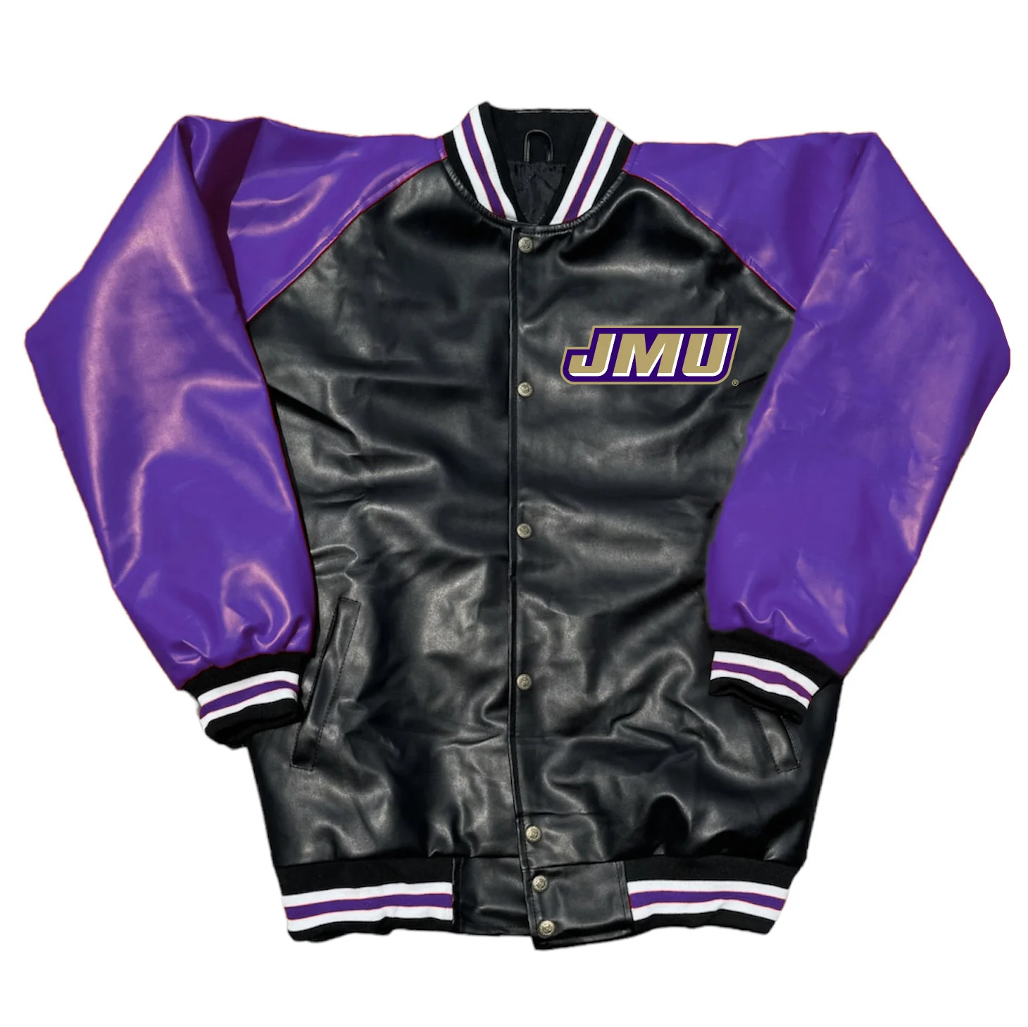 Show off your James Madison University (JMU) spirit with this stylish JMU Varsity Letterman Jacket. Crafted from 60% polyurethane and 40% PVC, this jacket offers a sleek, durable design with a soft viscose lining for all-day comfort. The buttoned front closure and front welt pockets add a classic varsity touch, while the relaxed fit ensures easy movement and style. Designed with full sleeves for warmth and coverage, this jacket is perfect for game days, campus life, or casual wear. Available in the bold Purple & Black color combination, it’s a must-have for any Dukes fan looking to showcase their pride in style.