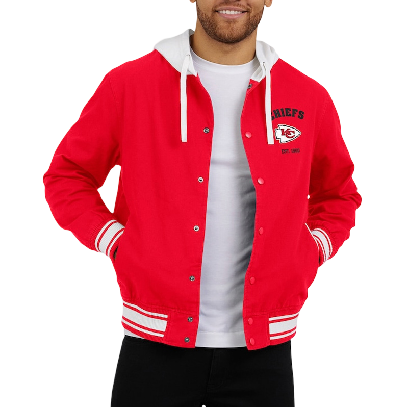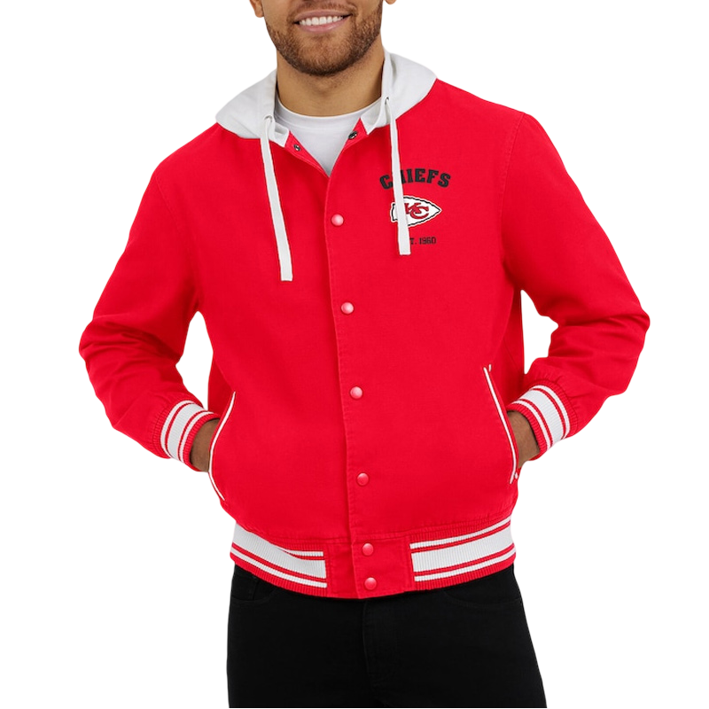 Stay bold and warm while repping your team in the Kansas City Chiefs Red Hooded Jacket. Designed for die-hard fans, this vibrant red jacket features the iconic Chiefs logo proudly displayed on the chest, making your team pride unmistakable. Made from soft, breathable cotton with a cozy fleece lining, it offers ultimate comfort during game days or everyday wear. The adjustable drawstring hood and ribbed cuffs provide extra protection against the cold, making this the perfect outerwear for any Chiefs supporter.