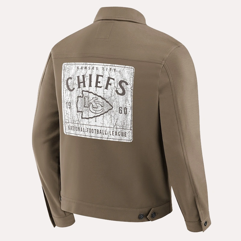 Crafted from durable tan cotton canvas, it features a traditional trucker-jacket silhouette with a button-front closure, flap chest pockets, and adjustable cuffs for a timeless, functional fit. Subtle Kansas City Chiefs embroidery or patches add understated team spirit, while a soft inner lining ensures comfort on game days or casual outings.