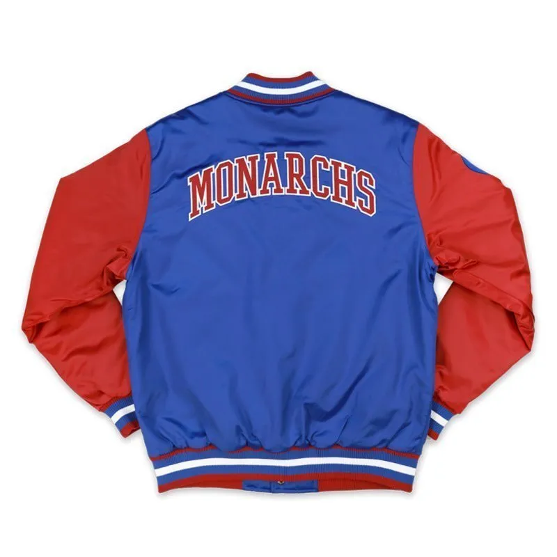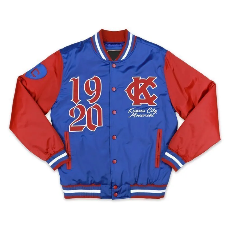 Celebrate the legacy of the Kansas City Monarchs with this stylish Blue and Red Baseball Jacket. Crafted from 100% premium satin fabric, this jacket offers a sleek and durable finish, perfect for both casual wear and game-day excitement. The snap-tab buttoned front closure adds a classic varsity touch, while the front welt pockets provide functionality with a refined look. Designed with a relaxed fit and full-length sleeves, this jacket ensures all-day comfort and effortless style. The soft viscose lining enhances breathability and warmth, making it ideal for any season. Stand out in the bold blue and red color combination, a true tribute to the rich history of the Monarchs and their lasting impact on baseball.