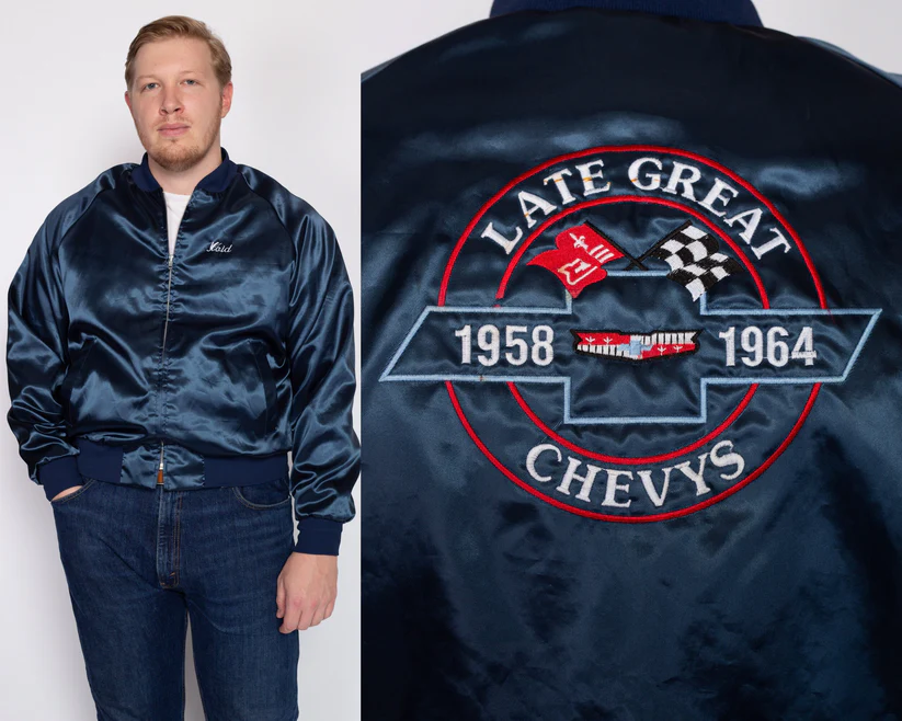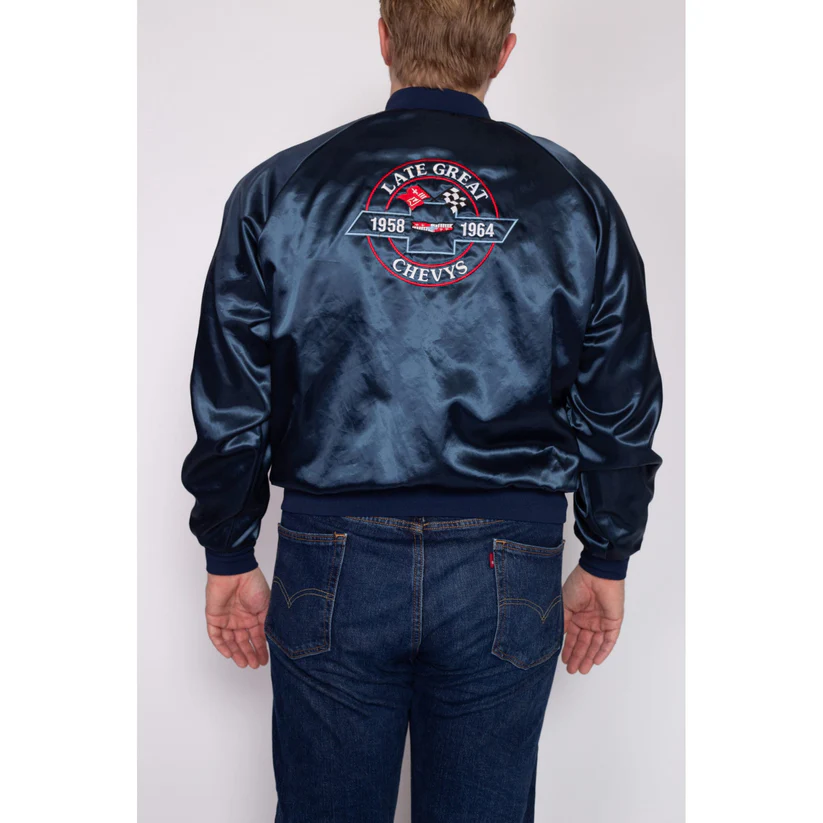 Large 70s Late Great Chevys Blue Satin Varsity Jacket