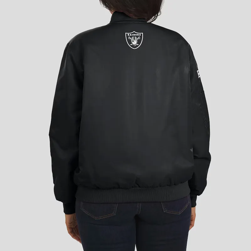 The Back: Features a massive, tonal-black “RAIDERS” wordmark in a high-gloss tackle twill, offering a stealthy yet undeniable presence.