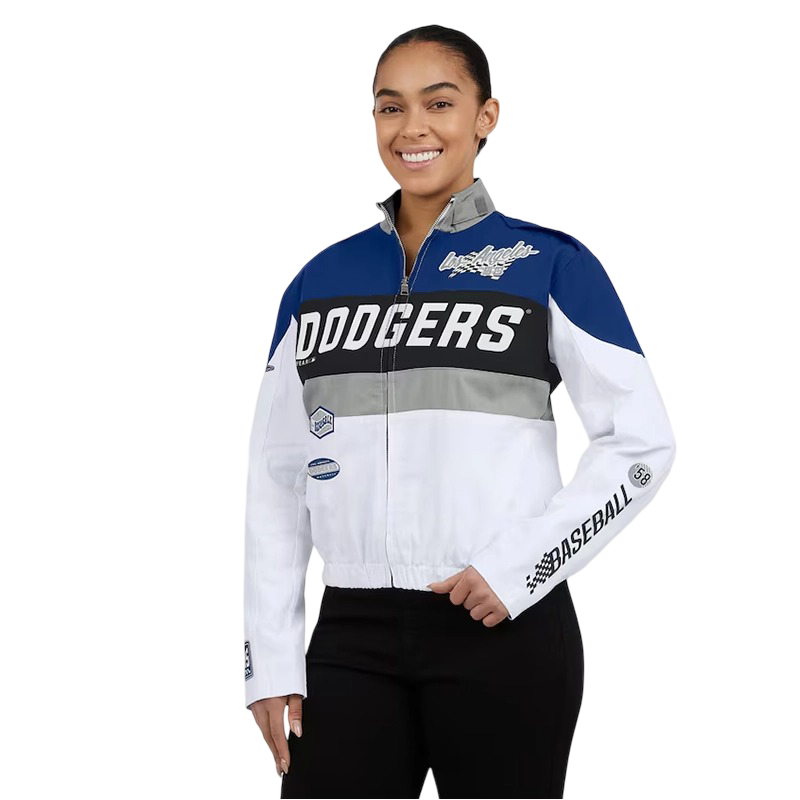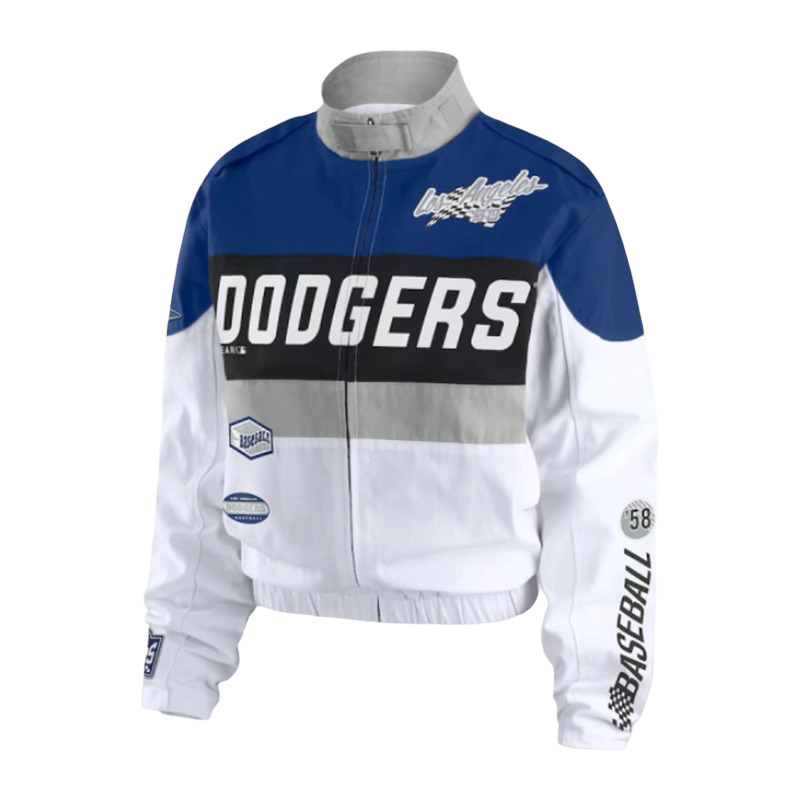 Rev up your game-day style with the Los Angeles Dodgers Racer Jacket — a bold fusion of motorsport edge and classic baseball pride. Designed for fans who move fast and cheer loud, this sleek jacket features dynamic racing-inspired design elements paired with official Dodgers branding.