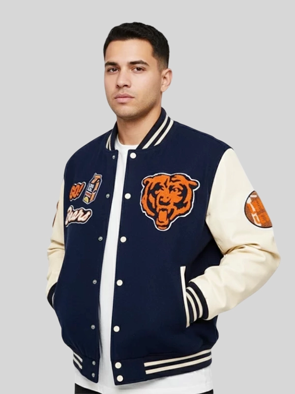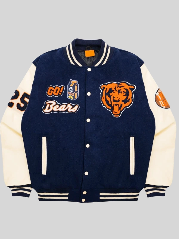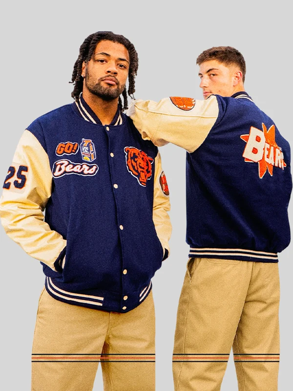 Iconic Colorway: Drenched in the Bears’ core colors of Navy Blue (body) and a contrasting color for the sleeves (often Cream/Beige or Yellow/Orange), anchored by striped rib-knit details.