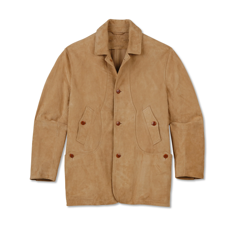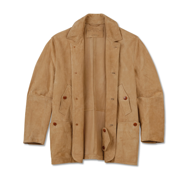 Inspired by classic utility wear, the coat features multiple front pockets, a button-front closure, and a structured collar for an effortlessly masculine silhouette. Its natural suede texture and rich earthy tone bring a versatile edge that transitions seamlessly from countryside weekends to city commutes.