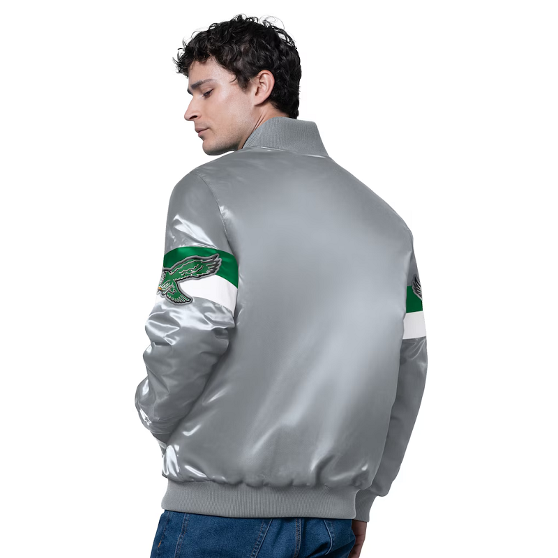 Made from premium satin fabric, it boasts a sleek silver body complemented by contrasting green and black rib-knit cuffs, collar, and hem for that authentic varsity feel. The highlight is the throwback Philadelphia Eagles vintage logo, embroidered proudly on the chest and back, celebrating the team’s legacy in bold detail. Inside, the soft quilted lining ensures warmth and comfort, while the snap-button front closure and side welt pockets add both functionality and old-school charm.