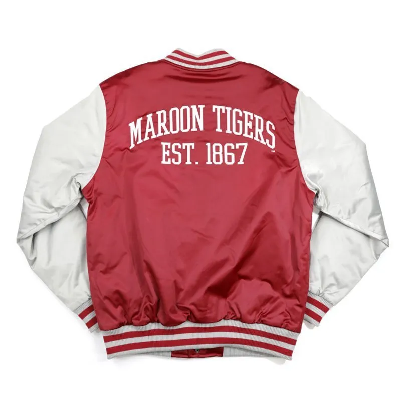 Showcase your Morehouse College pride with this sleek and stylish Maroon and Light Gray Baseball Jacket—a perfect blend of tradition, comfort, and timeless design. Made from 100% satin fabric, this jacket boasts a smooth, premium finish that enhances both durability and style. The snap-tab buttoned front closure offers a classic varsity touch, while the relaxed fit ensures all-day comfort and ease of movement. Featuring full-length sleeves and a soft viscose lining, this jacket provides warmth without feeling heavy. The front welt pockets add both functionality and a fashionable edge, making it the perfect outerwear choice for game days, campus events, or everyday casual wear. Represent Morehouse with confidence in this must-have baseball jacket!