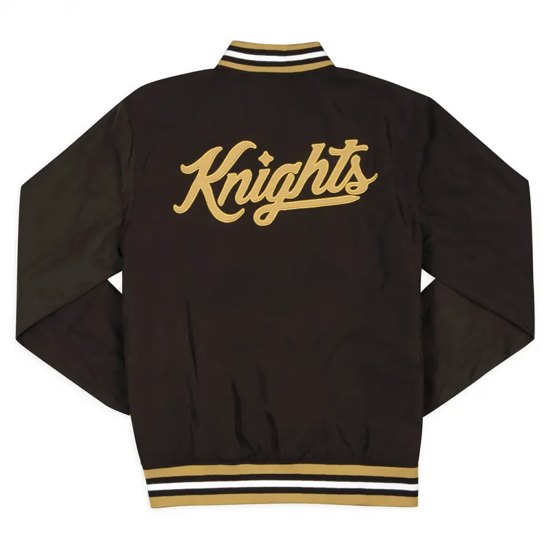Heavyweight Chenille Script: The front features a massive, multi-layered “Knights” script in high-density gold-and-white chenille, giving the jacket a premium, varsity heritage feel.