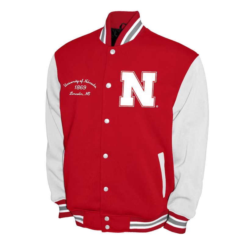 Show your Husker pride in timeless style with the College Nebraska Huskers Scarlet and White Varsity Fleece Jacket — the ultimate blend of team spirit, comfort, and everyday wearability. Designed for true Nebraska fans, this jacket brings together classic varsity aesthetics and cozy fleece warmth, perfect for chilly game days or casual outings.