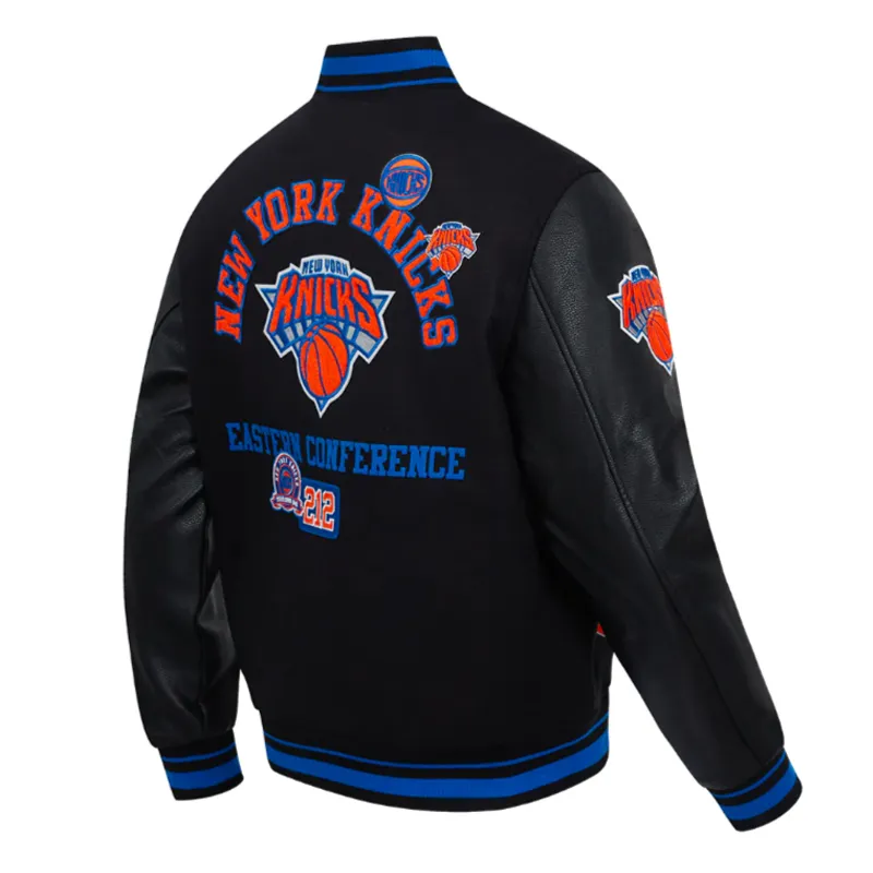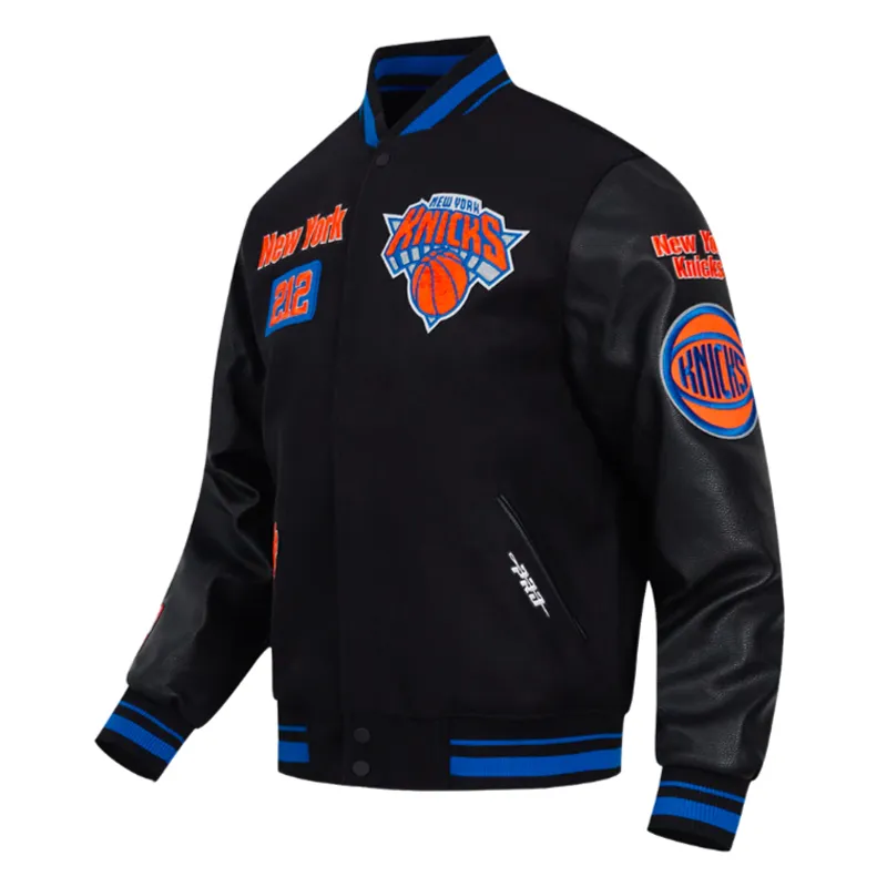 he NY Knicks Area Code Classic Rib Wool Varsity Jacket is a timeless addition to any wardrobe, combining style and comfort. Crafted from 100% high-quality wool fabric, this jacket offers warmth and durability, making it perfect for both casual wear and outdoor adventures. Its sleek black color adds a touch of sophistication, while the snap-tab closure and front welt pockets provide functionality. The relaxed fit ensures comfort throughout the day, and the full sleeves keep you cozy during cooler weather. Inside, the jacket features a soft viscose lining that enhances comfort. Whether you’re a basketball fan or simply looking for a stylish, versatile jacket, this piece is a must-have.