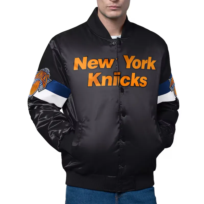 Crafted from premium satin, it features a smooth, lightweight finish with the signature Starter shine. The full-snap front, rib-knit collar, cuffs, and waistband, and traditional varsity silhouette deliver authentic throwback appeal. Bold New York Knicks logos, embroidered detailing, and team color accents make this jacket stand out wherever you go.