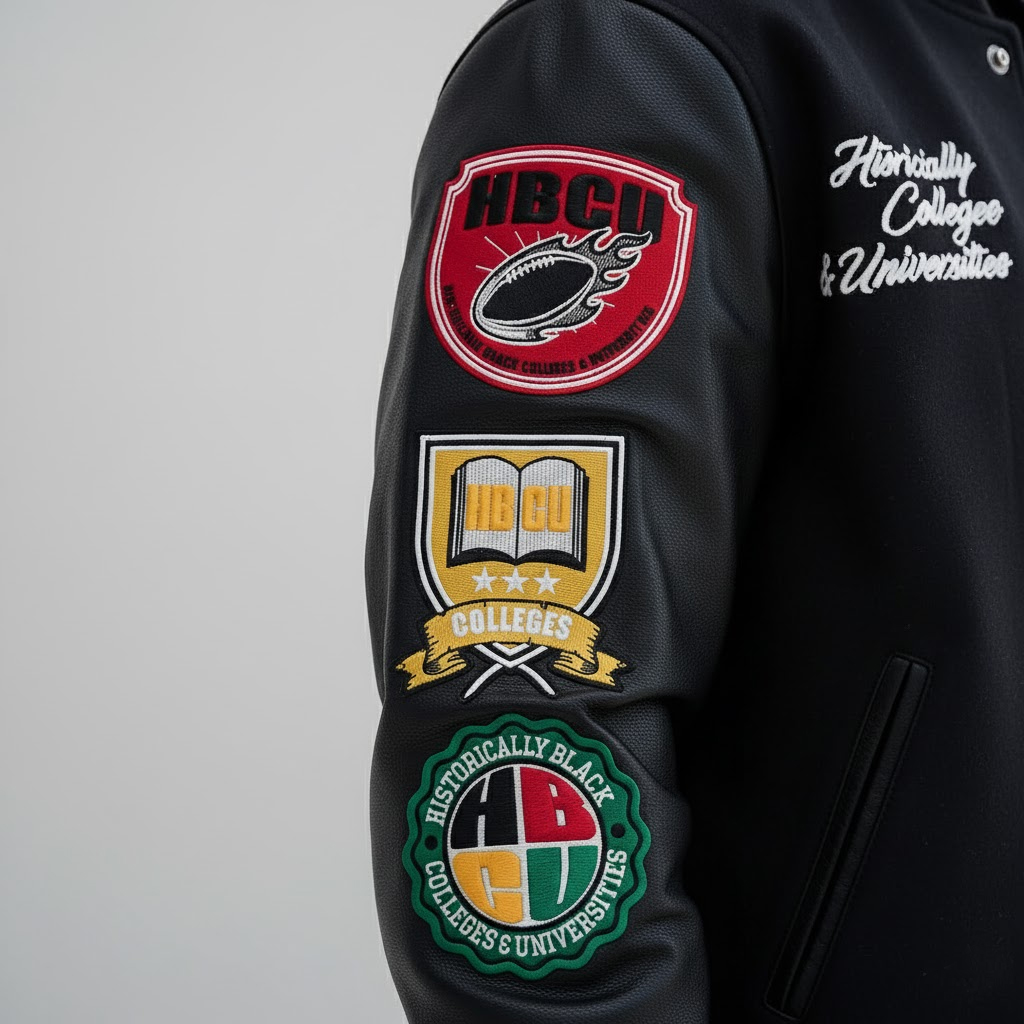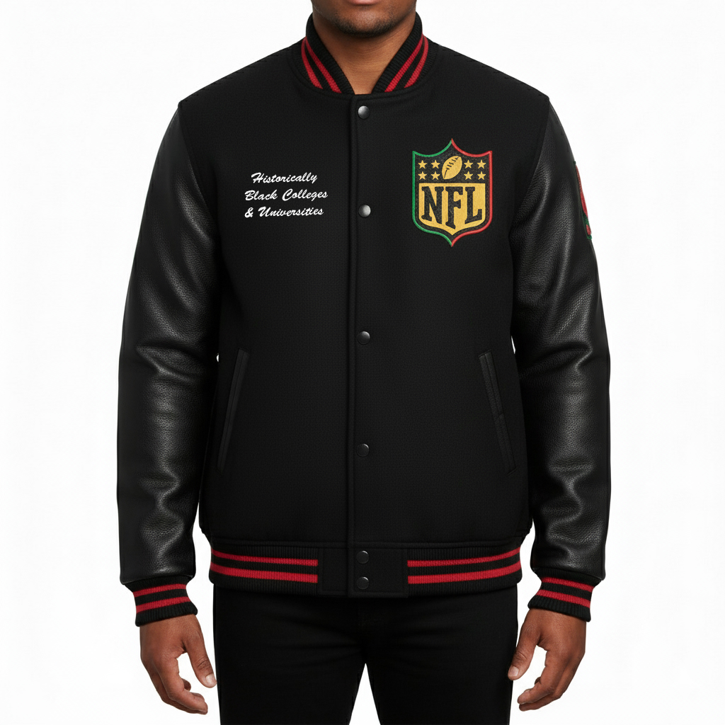 Celebrate heritage and pride with the Men’s Black HBCU (Historically Black Colleges and Universities) x NFL Full-Snap Varsity Jacket. Expertly crafted with a premium wool body and genuine leather sleeves, this jacket blends timeless varsity design with modern craftsmanship. The rib-knitted collar, cuffs, and hem provide a classic fit, while the soft viscose lining ensures comfort and warmth. Featuring a snap-tab button closure and a relaxed fit, it’s perfect for showcasing your HBCU legacy and NFL spirit in style—ideal for casual wear, game days, or everyday outings.