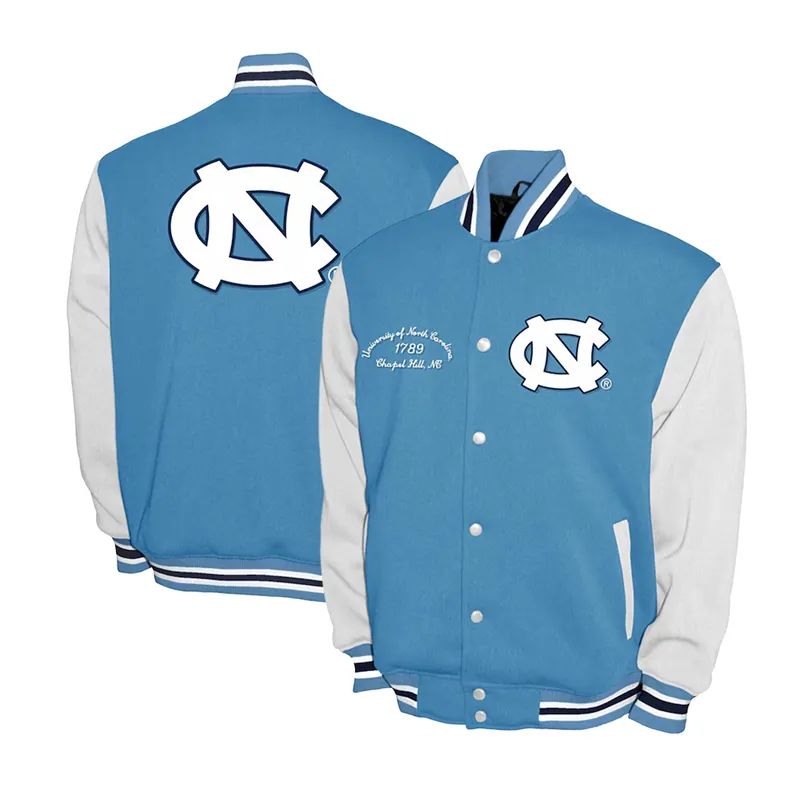 Show off your Tar Heel pride in timeless collegiate style with the College NCAA North Carolina Tar Heels Varsity Jacket — a perfect blend of school spirit, comfort, and vintage flair. Designed in the team’s signature Carolina blue and white color scheme, this jacket proudly reflects the legacy and excellence of UNC athletics.