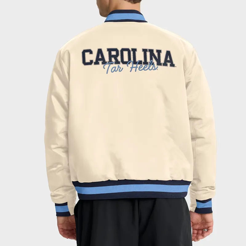 Step out in timeless collegiate style with the Cream NCAA North Carolina Tar Heels Legacy Bomber Jacket — a refined blend of heritage, comfort, and Tar Heel pride. Designed for true UNC fans, this jacket celebrates the team’s legacy with a classic cream satin finish, embroidered Tar Heels logos, and a sleek varsity-inspired silhouette.