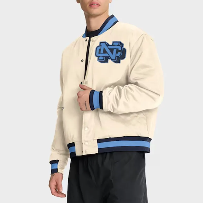 North Carolina Tar Heels Legacy Bomber Cream Satin Jacket Full-Snap