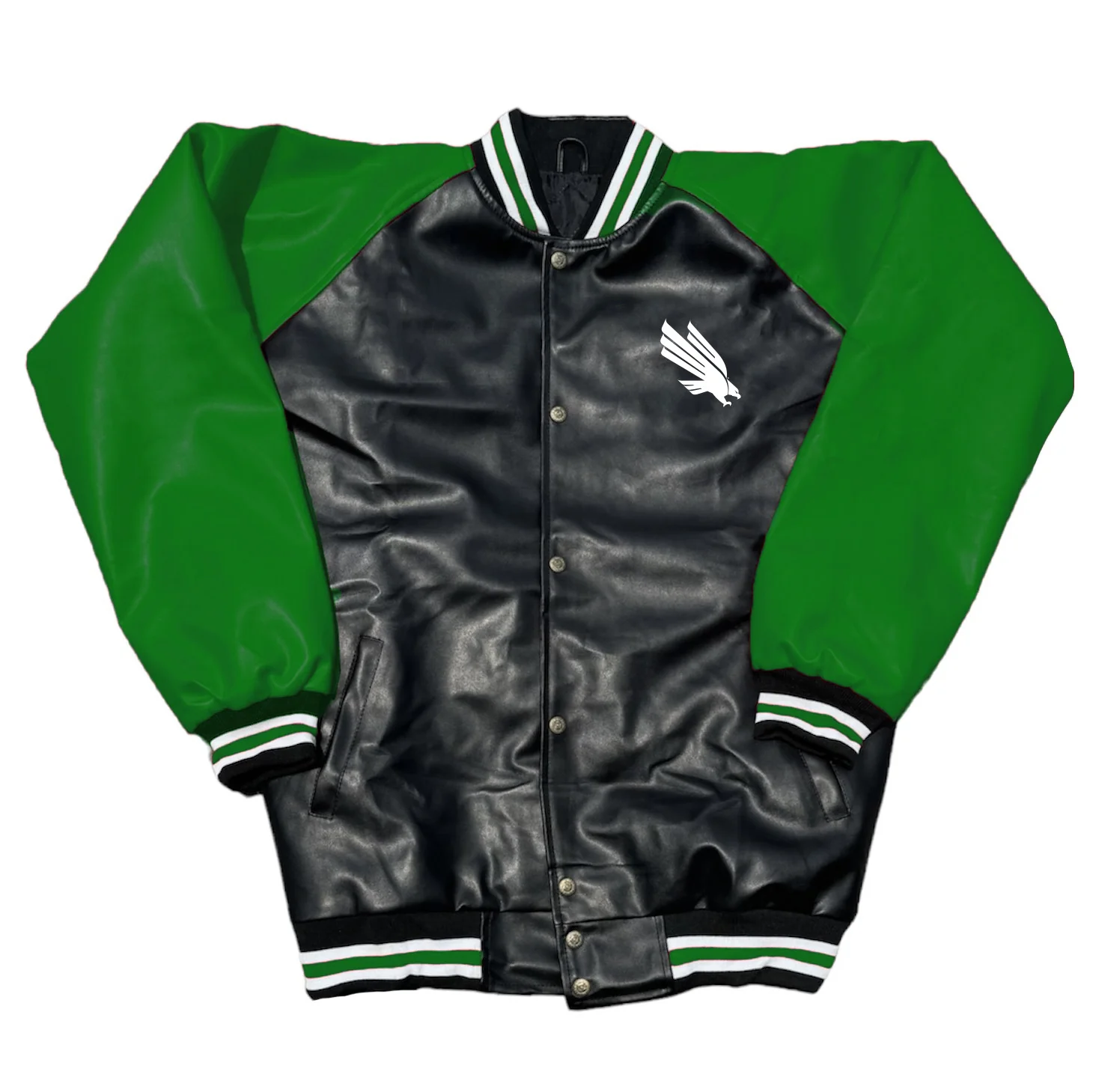 Show off your North Texas Mean Green pride with this stylish Varsity Letterman Jacket. Designed for ultimate comfort and durability, this jacket is made from a premium blend of 60% polyurethane and 40% PVC. The vibrant green color represents school spirit, while the buttoned front closure adds a classic touch. Featuring front welt pockets for convenience and a relaxed fit for all-day wear, this jacket is lined with soft viscose for warmth and comfort. The full sleeves provide extra coverage, making it perfect for chilly game days or casual outings. Elevate your fan gear with this must-have piece!