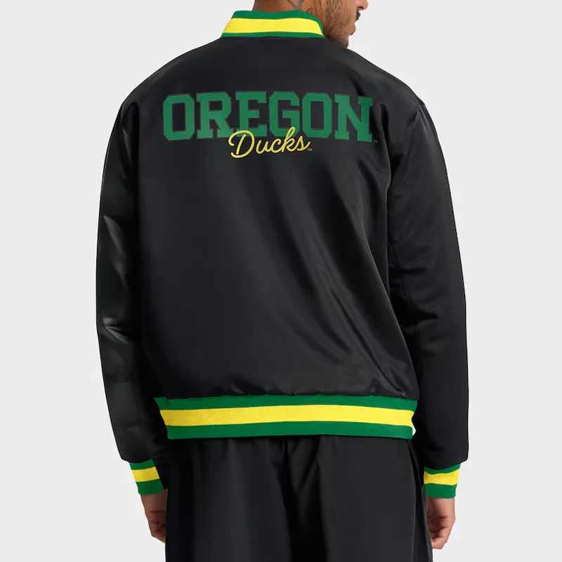 Celebrate your Oregon pride in timeless style with the Black NCAA Oregon Ducks Legacy Bomber Jacket — a perfect blend of sporty tradition and modern streetwear flair. Designed for true Ducks fans, this jacket captures the legacy of Oregon athletics with a sleek black satin finish, embroidered team graphics, and a classic bomber silhouette.