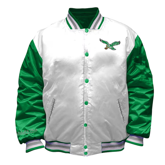 Made from smooth, heavyweight satin, it features a crisp white base accented with kelly green and black details that nod to the team’s historic colors. The snap-button front, striped rib-knit cuffs, collar, and hem provide a secure, retro-inspired fit, while authentic throwback Philadelphia Eagles graphics bring unmistakable pride to your look.