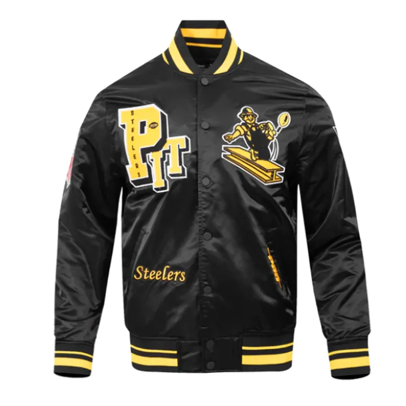 Constructed from luxurious black satin, it features a smooth, glossy finish that gives off a sleek, elevated look. The embroidered Pittsburgh Steelers logo is proudly displayed on the chest, while a large team wordmark spans across the back, making your allegiance impossible to miss. The rib-knit striped collar, cuffs, and waistband add a touch of vintage varsity flair, staying true to the spirit of classic NFL sideline jackets.